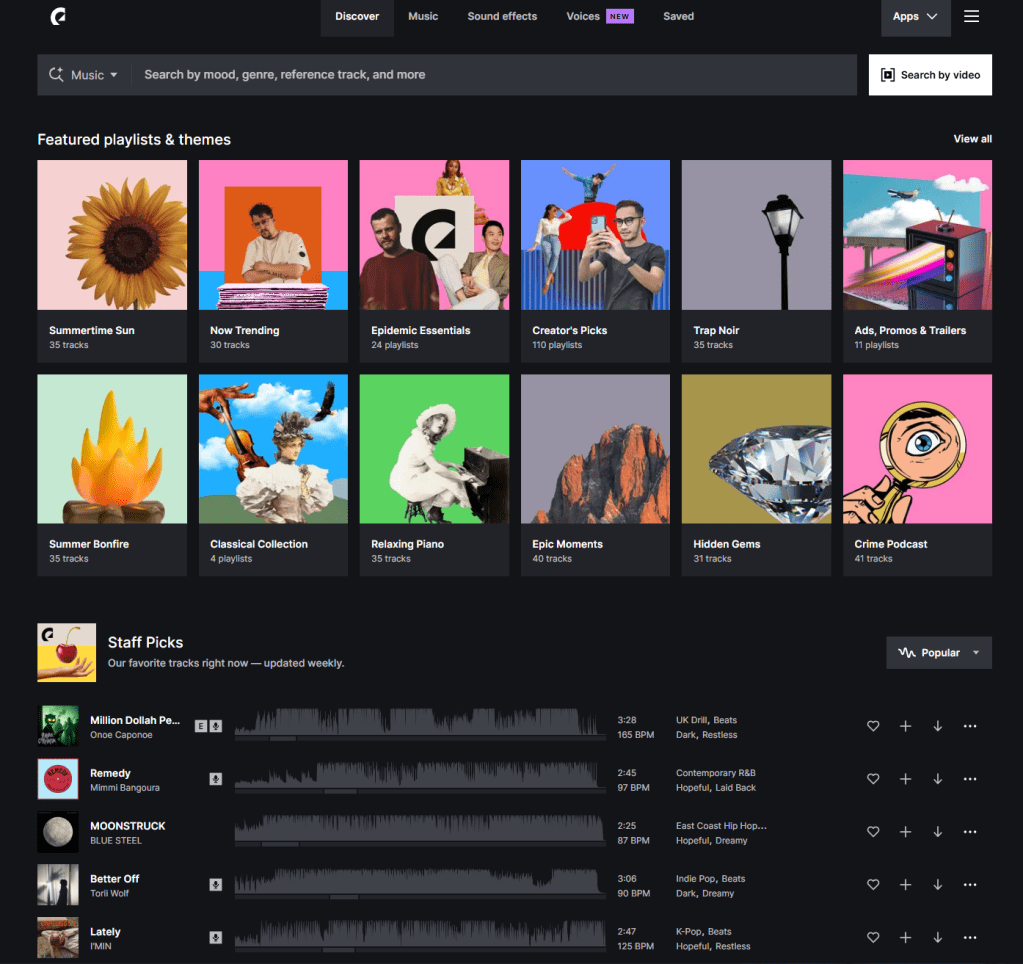 에피데믹 사운드 사이트는 이렇게 생겼습니다.